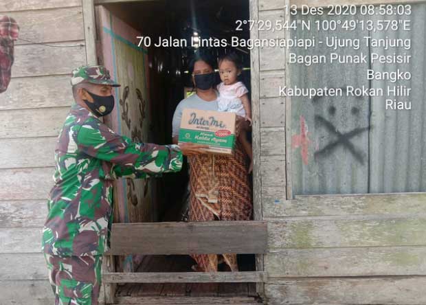 Anggota Koramil 01/Bangko Dpp Sertu Alpin bersama 2 anggota pada Minggu 13 Desember 2020 melaksanakan kegiatan pemberian bantuan sembako di Jalan SMK Kepenghuluan Bagan Punak Meranti Kecamatan Bangko.