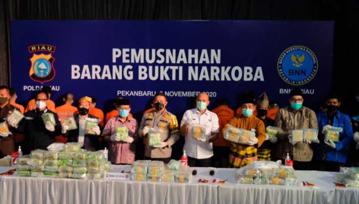 "Pengungkapan kasus narkotika ini dilakukan dari Bulan Oktober sampai 5 November 2020. Dari kasus ini melibatkan 11 orang pelaku. Untuk barang buktinya diamankan dari BNNP dan Polda Riau," terang Irjen Agung yang didampingi Kepala BNNP Riau, Brigjen Kennedy, dimako Brimob Kamis sore (5/11/2020)