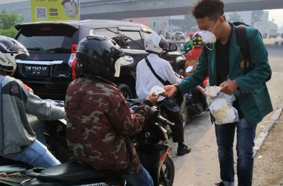 "Hari ini, Kamis (8/8/2019) kita bekerjasama dengan BEM UMRI dan UIR serta pihak kepolisian membagikan 5000 masker kepada pengendara kenderaan bermotor dan masyarakat di simpang lampu merah Simpang Mall SKA," Kata Alfian