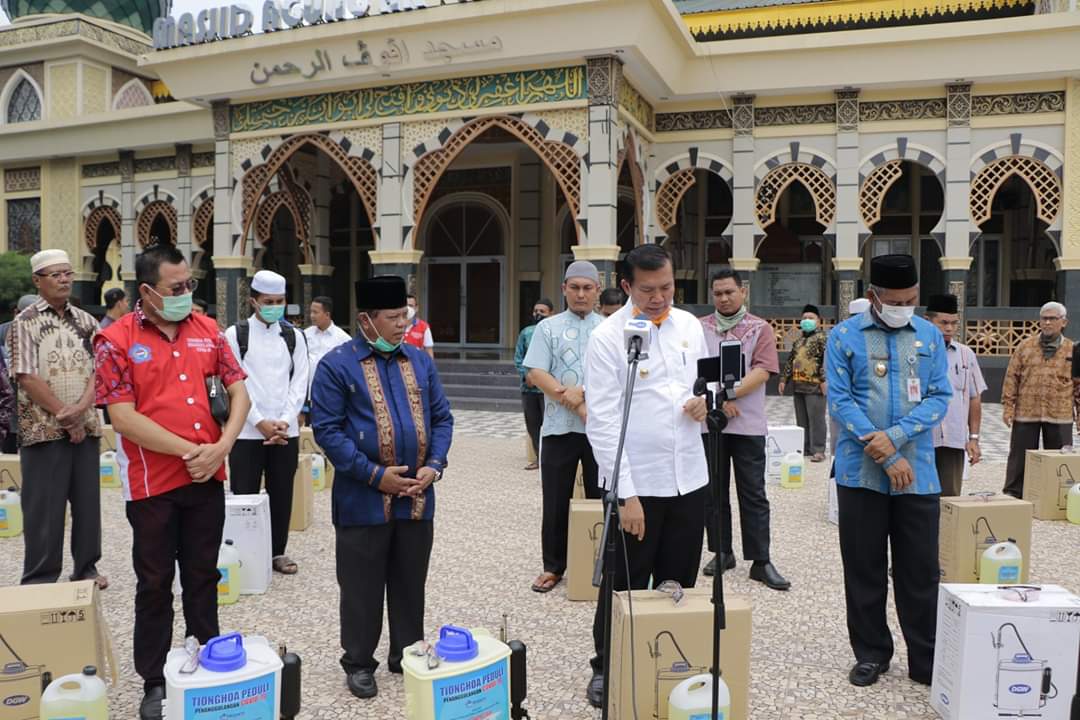 (RIAUHITS.COM) - Walikota Pekanbaru DR. H. Firdaus, MT, menyerahkan bantuan disenfektan dan hand sanitizer serta alat pelindung diri (APD) untuk imam Masjid Paripurna se kota Pekanbaru bertempat di halaman Masjid Paripurna Arrahman Jalan Jenderal Sudirman, Kamis (2/4/2020).